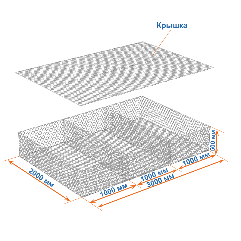 Габионные матрасы Рено 3х2х0,5: ячейка 60х80, диаметр проволоки 2,2 мм, покрытие Цинк.