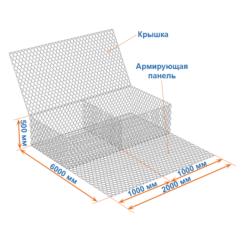 Габион с армирующей панелью 6x2x0,5 – это коробчатый габион, состоящий из основной части (короба) и армирующей панели (хвоста). Изготавливается габион из сетки двойного кручения.